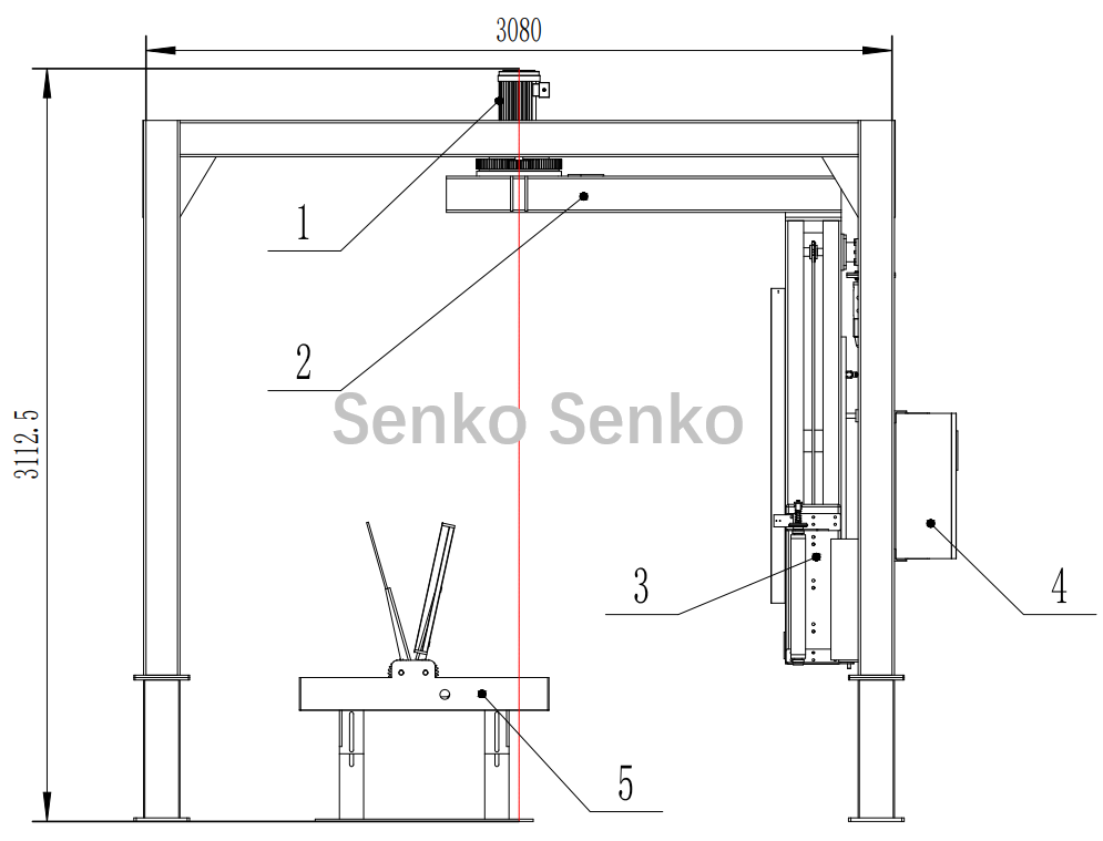 | 1, Motor rotatorio | 2, Bastidor giratorio | 3, Bastidor de elevación | 4, Gabinete de control electrónico | 5, cortador de película |