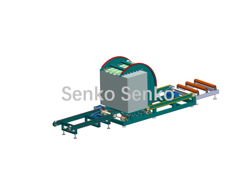 Tras apilar los palets vacíos, un transportador de rodillos los transporta al mecanismo de volteo de pilas. Este mecanismo permite girar los bloques apilados 90 grados para que las aberturas se puedan retirar con una carretilla elevadora, lo que reemplaza el volteo manual, ahorra mano de obra, evita accidentes y protege los bloques de daños.