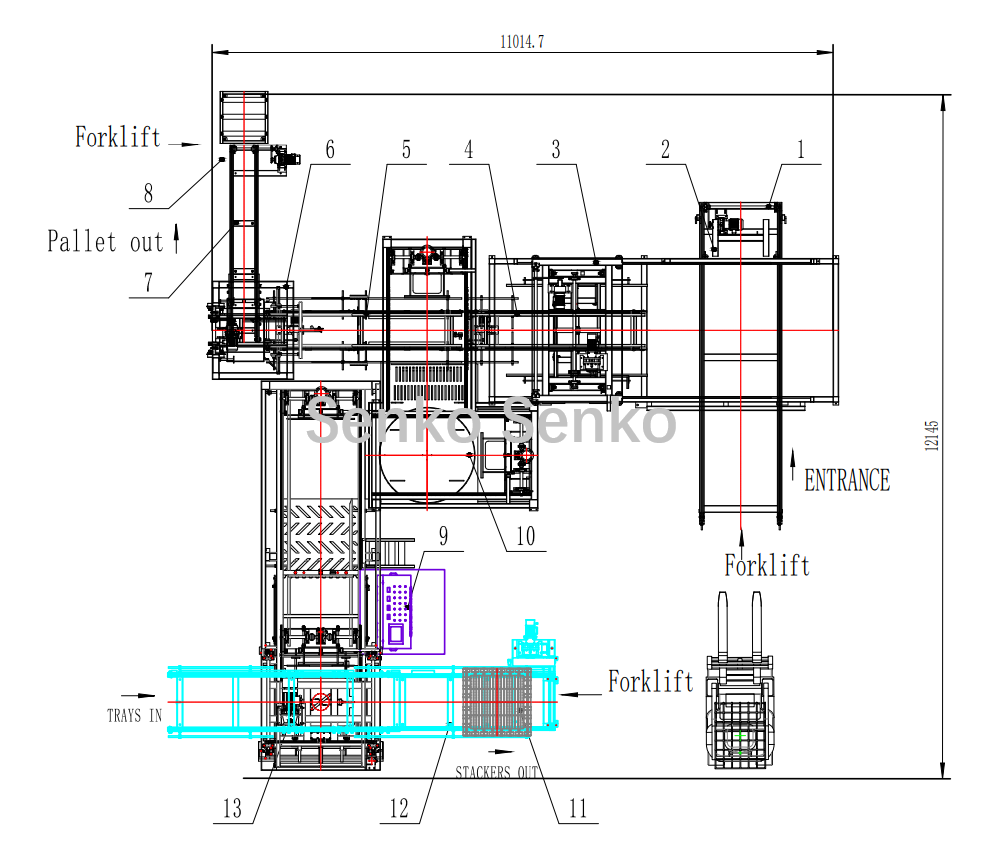 | 6.Máquina paletizadora | 7. Transportador de apilado de paletas | 8. rodillo transportador | 9. Armario de control electrónico | 10.Unidad de plato giratorio |