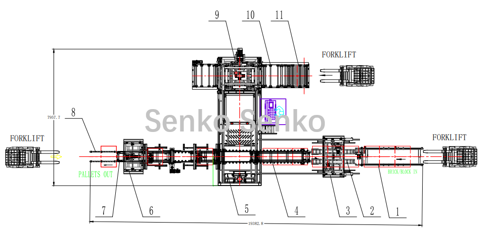 Los tableros de ladrillo transportados por la carretilla elevadora, cada palé cargado con ladrillos/bloques curados, se transportan a la zona de reserva de elevación de palets. La máquina elevadora toma los palets de ladrillos capa por capa, por delante y por detrás, arriba y abajo, y los envía a la cinta transportadora antes de la separación de los ladrillos/bloques y los palets.