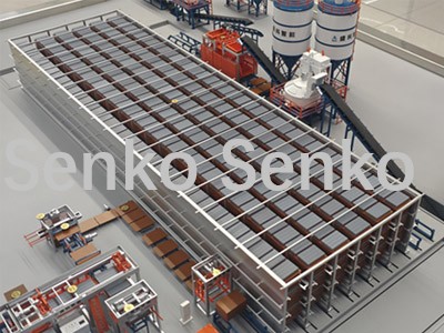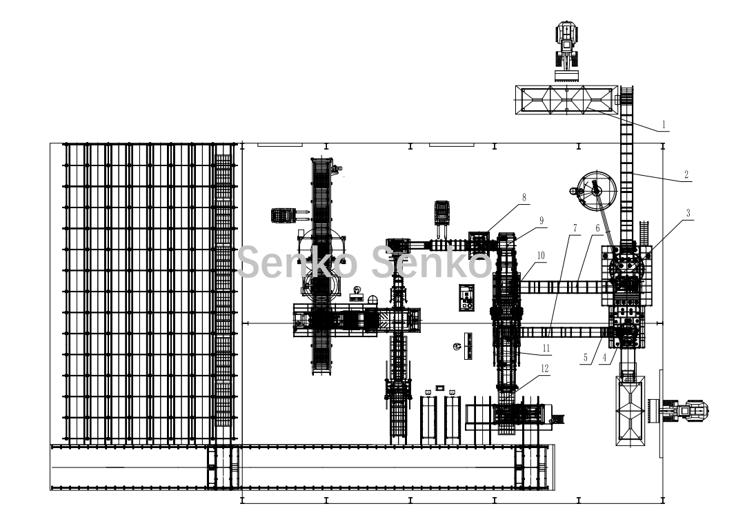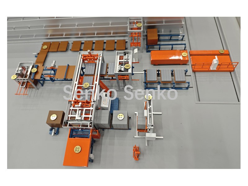 | 11, Separador de palets de ladrillo | 12, Transportador de palets vacíos | 13,Paletizador sin ladrillo | 14, Apilador de ladrillos | 15, Transportador de pilas |