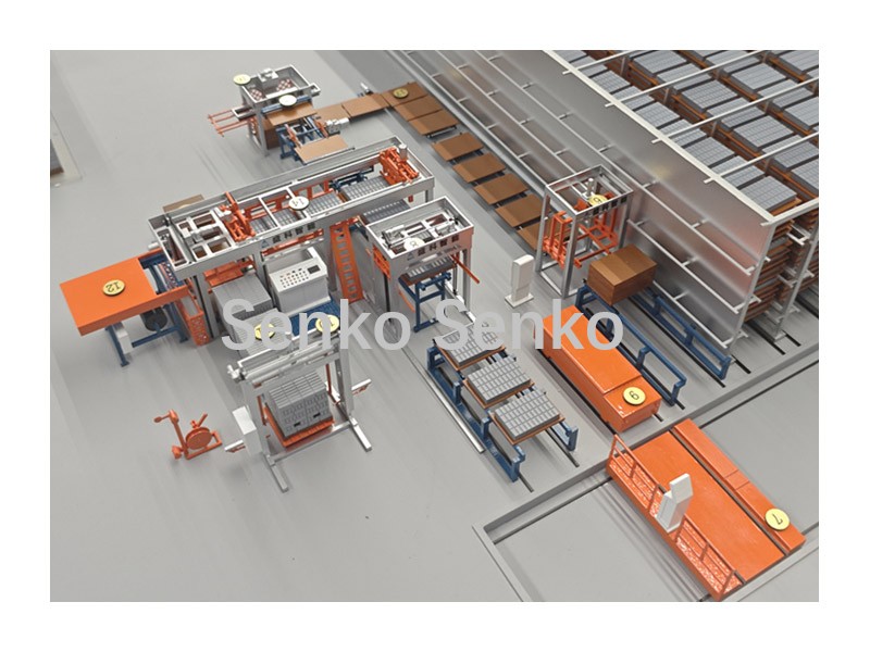 | 16, Máquina desforradora rotativa inferior | 17, Carro de transferencia | 18,RGV | 19, Estación de carga | 20, Horno de curado |