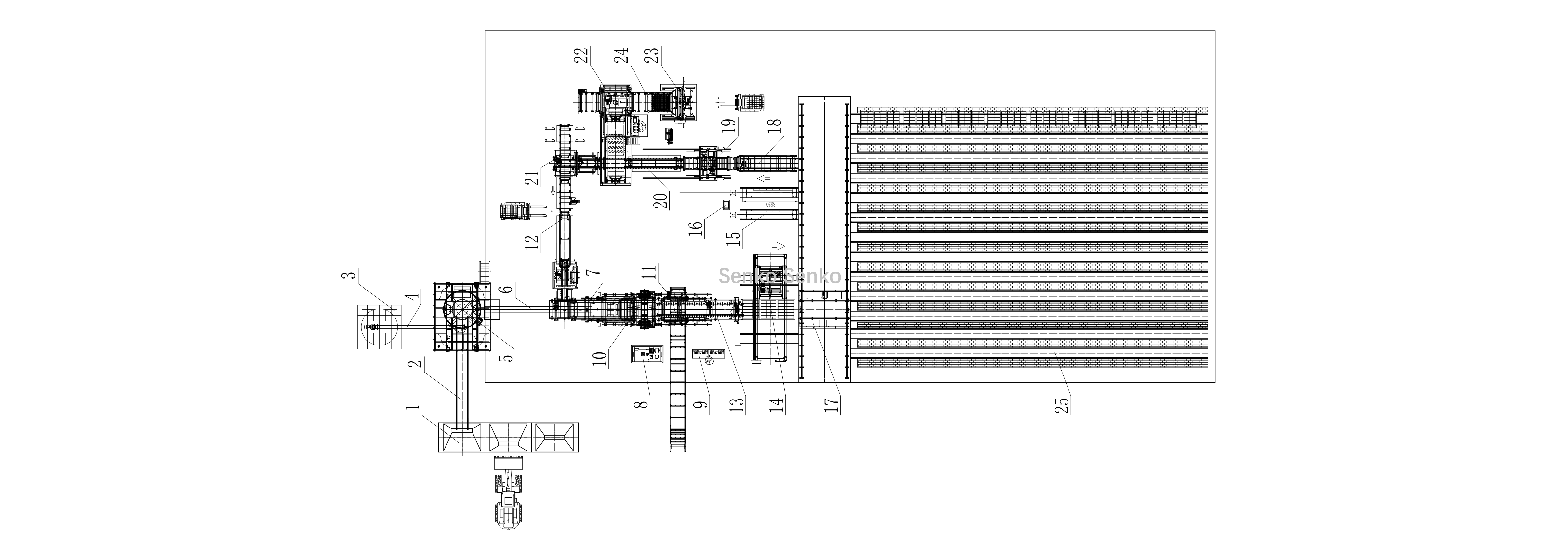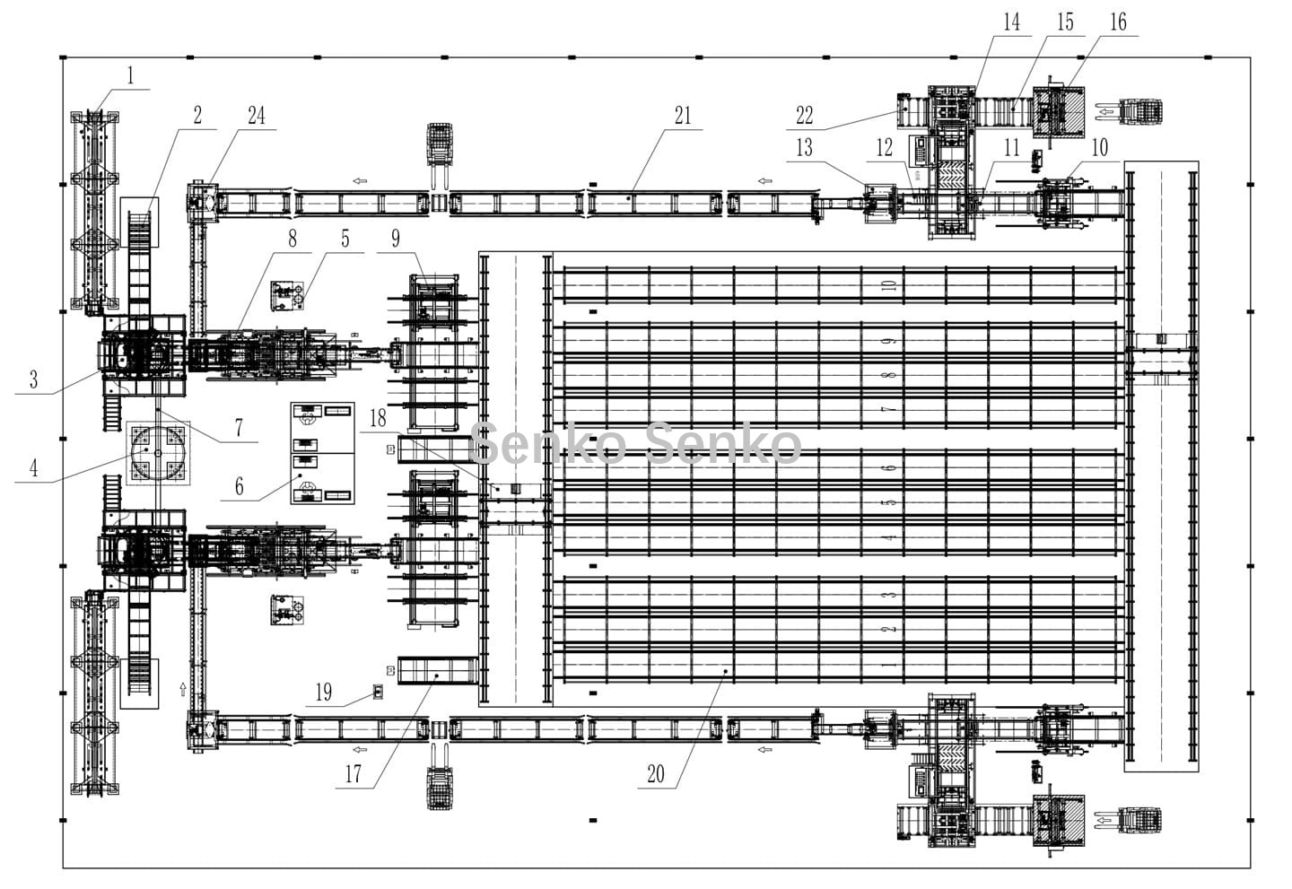 | 21, Paletizador | 22, Máquina apiladora de ladrillos | 23, Empaquetadura rotatoria inferior | 24, Transportador de pilas | 25, Horno de curado |